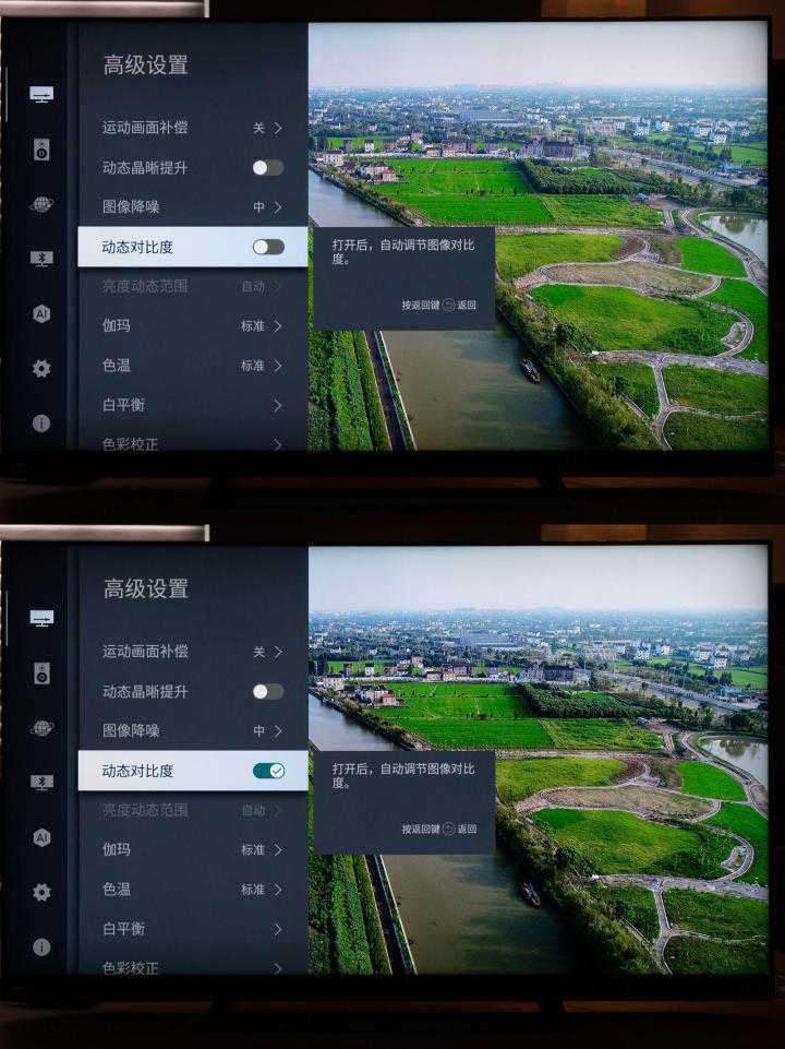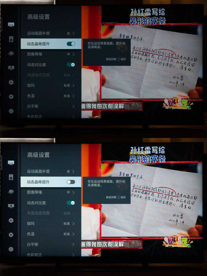 在开启动态晶晰提升后,画面的锐度会得到一定的提升,不过同时亮度会有些降低。