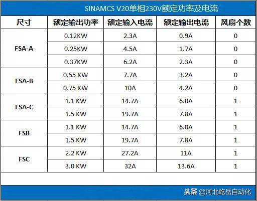 单相230VAC变频器的FSA-A、FSA-B两款没有散热风扇;FSA-C、FSB和FSC三款变频器有一个散热风扇;不同尺寸的变频器的额定功率及电流见下面的表格: