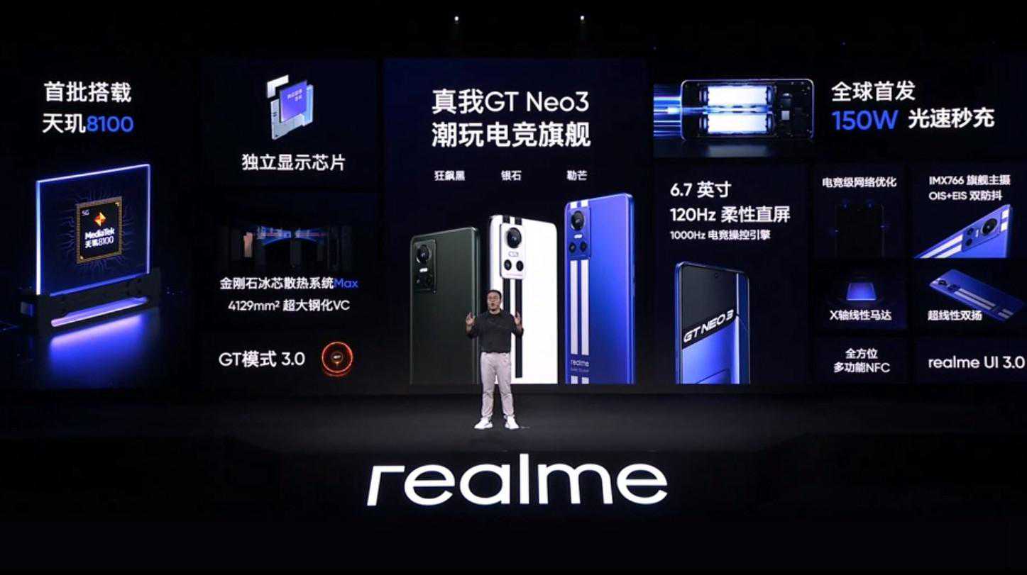 3月22日,realme真我正式发布搭载联发科天玑8100的真我GTNeo3。新机核心卖点是天玑8100、首发150W快充、带OIS的IMX766主摄,分为5000mAh电池+80W快充的普通版,以及4500mAh电池+150W的快充版。