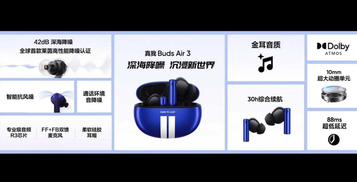 另外,真我还发布了真我BudsAir3无线降噪耳机,蓝黑、勒芒(蓝)、白三色可选,IPX5防水。42dB降噪深度,宣称最低延迟88ms,10mm动圈,LCP振膜,realmeR3定制芯片。单体续航7小时,整体30小时,充电10分钟,听歌100分钟。定价399元,首发349元。