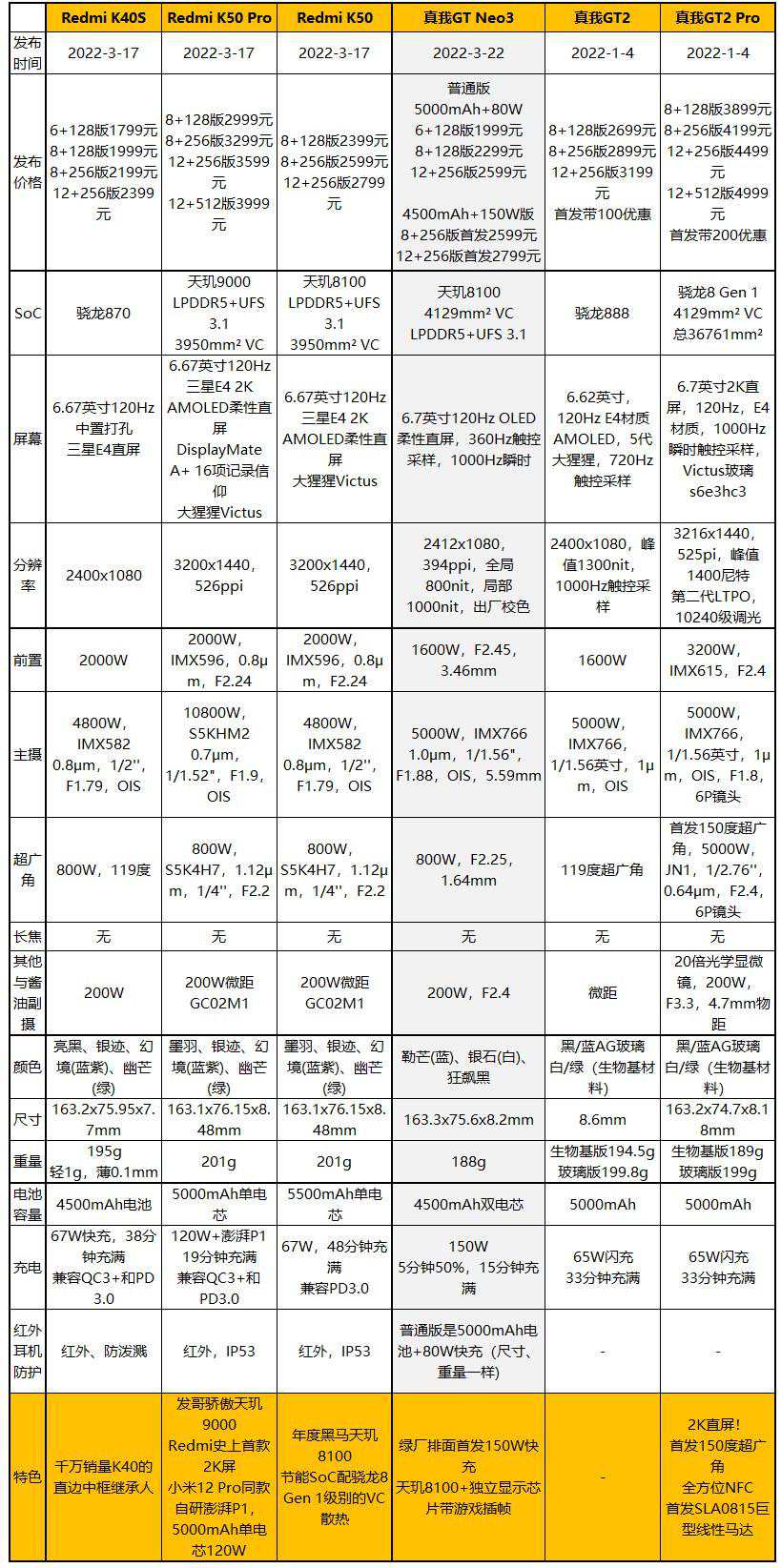 虽然都是天玑8100,但真我GTNeo3和友商RedmiK50是完全不同设定的产品。真我GTNeo3是轻量化、相机和快充强化版本,多了显示芯片(游戏插帧)。而K50是2K屏+67W+5500mAh电池。