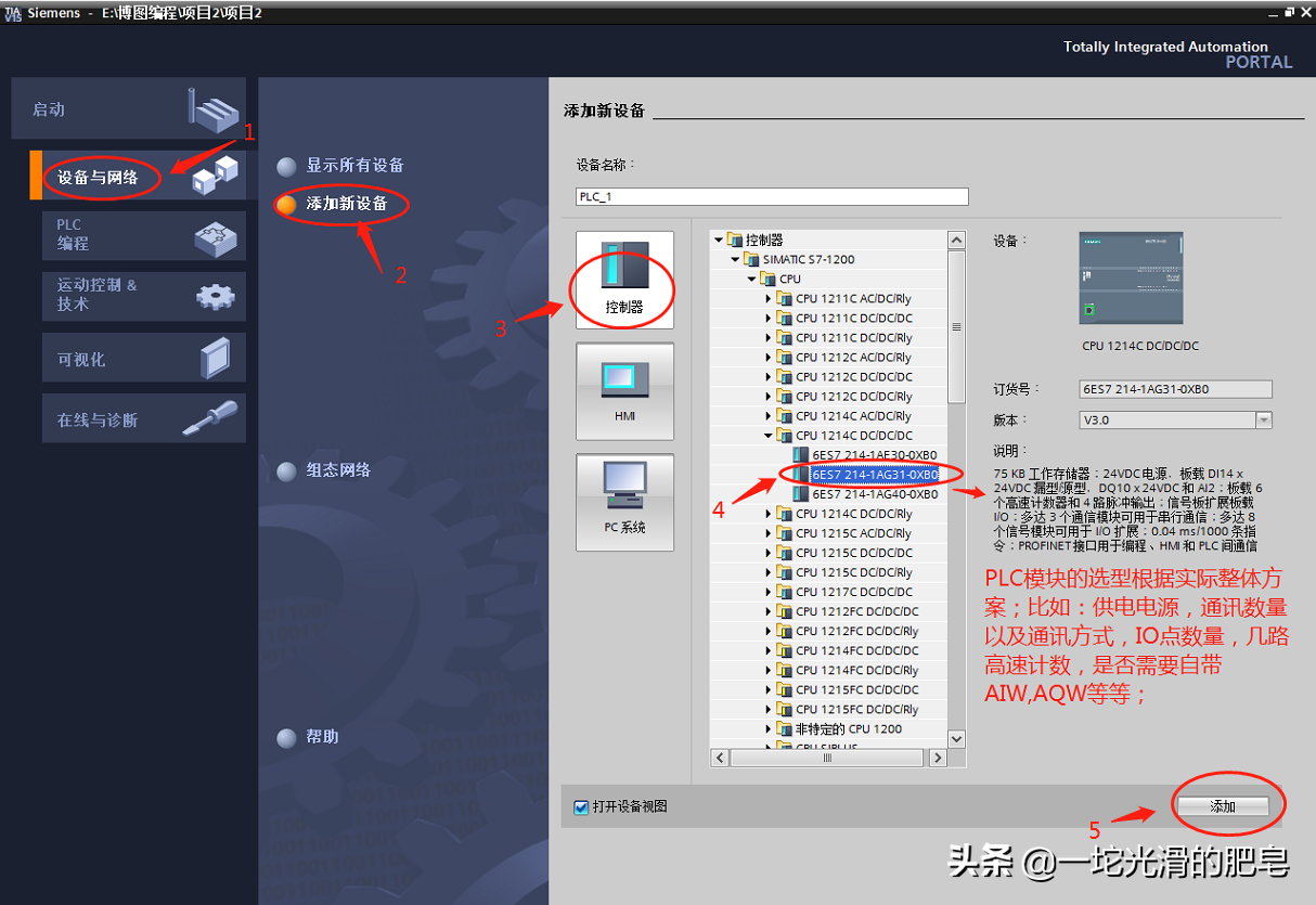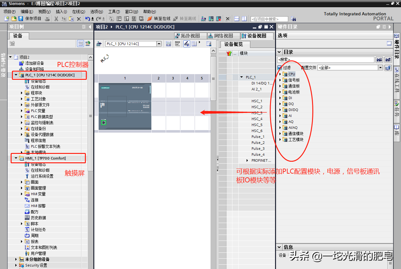 注:TIA博途是全集成自动化软件TIAportal的简称,是西门子工业自动化集团发布的一款全新的全集成自动化软件;软件版本主要可分V13V14V15,是一个集成西门子旗下各类常用的软件集成包,PLC,触摸屏,变频器等等,主要包括step7、wincc和触摸屏软件,basic版本主要包括step7和触摸屏的部分组态软件。,advanced版本与basic相比可以组态所有的触摸屏,profession版本包括advanced版本及普通的wincc;图中所选PLC控制器和触摸屏,并没有一定规划和设计选型,只是简单地演示下新建项目以及选择PLC控制器和触摸屏和扩展模块。