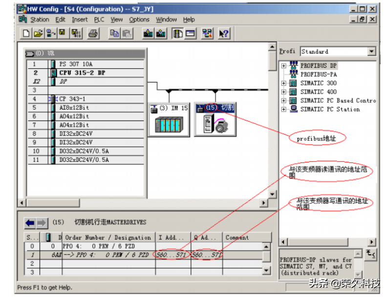 在STEP7软件中创建一个项目,再硬件组态该项目,并建一个PROFIBUS-DP网络,变频器在PROIBUSDP-SIMOVERT文件夹里进行组态,并设定好通讯的地址范围。如下图所示:
