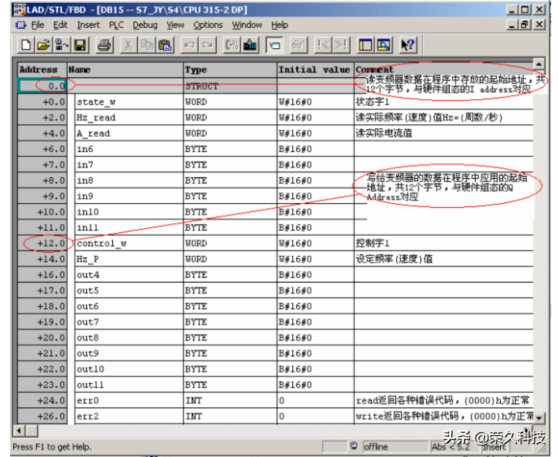 一般地,读写数据都做在一个DB块中,且最好与硬件组态设定的I,O地址范围大小划分相同大小的区域,便于建立对应关系和管理。如下图所示,读变频器的数据的12个字节在DB0~DB11中,写给变频器的12个字节数据放在DB12~DB23中。接下来还可以存放诸如通讯的错误代码和与变频器有关的其它计算数据。