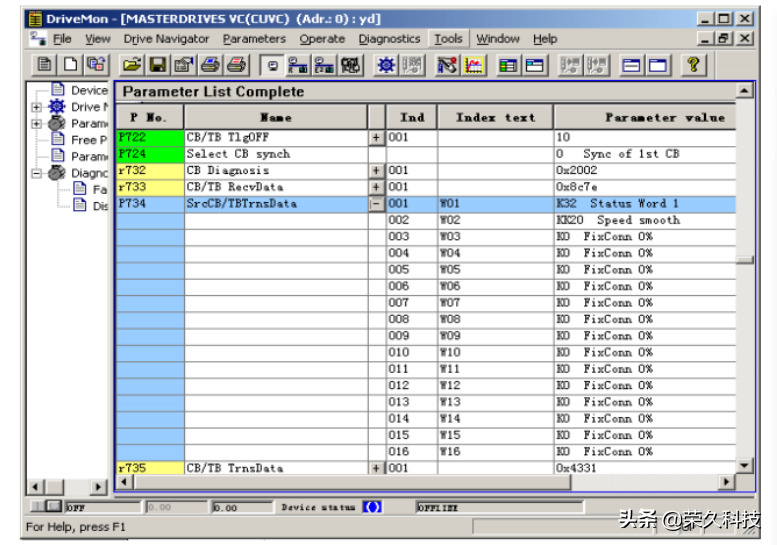 即~对应P734的W01~W06。~对应k3001~k3012。PLC读取变频器的数据可以通过设置参数P734的值来实现,PLC写给变频器的数据存放在变频器数据k3001~k3012中,在变频器的参数设置里可以进行调用,从而建立了彼此的对应关系。