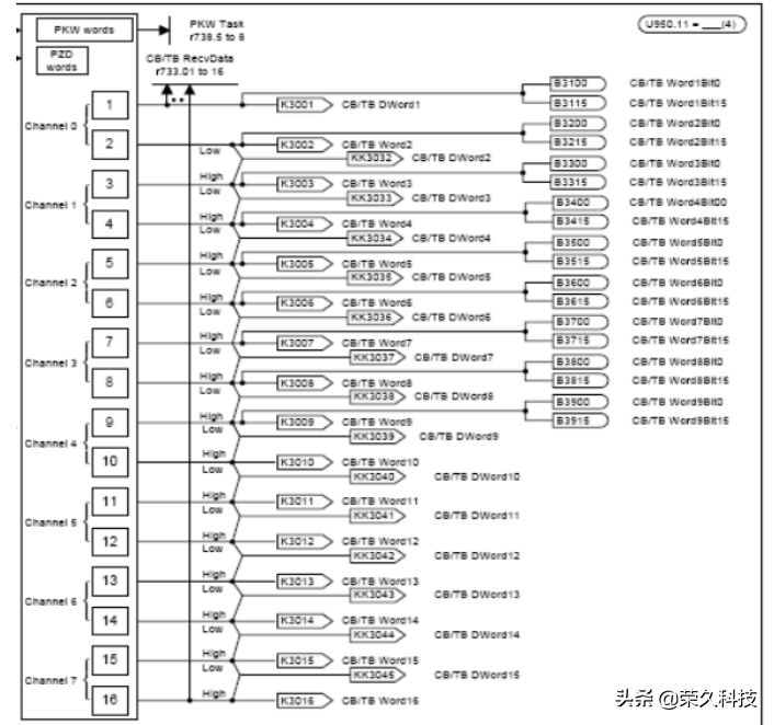 对于写变频器的数据是与变频器的k3001~k3016(参见变频器使用大全功能图120)建立对应关系,读变频器的数据则是与变频器的参数P734建立对应关系。如下图所示: