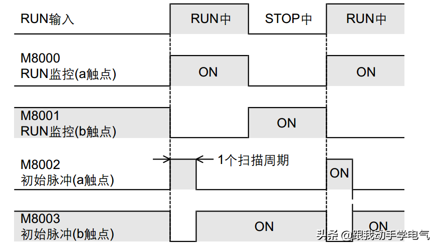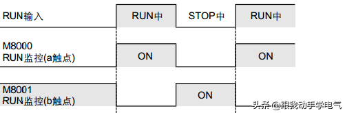 这里用到的是初始脉冲(M8002,M8003):在PLC开始运行以后,仅瞬间(第一个扫描周期)为ON(M8002)或OFF(M8003),这个脉冲可以作为程序初始化或写入规定值等程序中的初始设定信号使用。