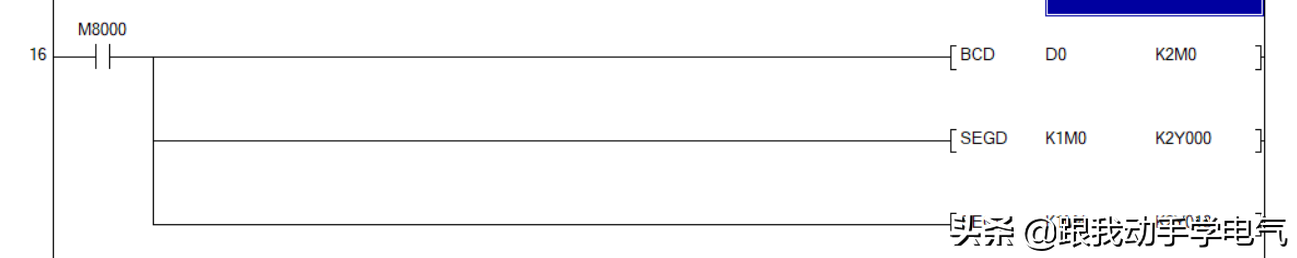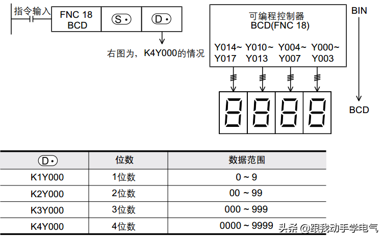 b、BCD转换指令:将BIN(2进制)转换成BCD(10进制)后传送的指令。在PLC中的运算按照BIN数据进行处理,在带BCD译码的7段显示器中显示数制时可使用本指令。16位运算。