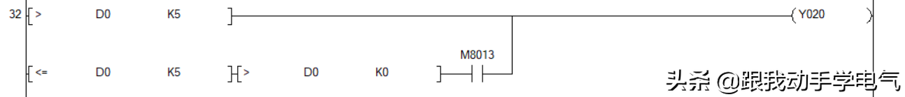 当D0中的数值小于等于5大于0,同时调用内部1s时钟8013,来实现Y20闪烁。
