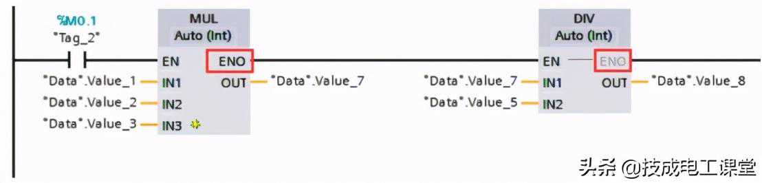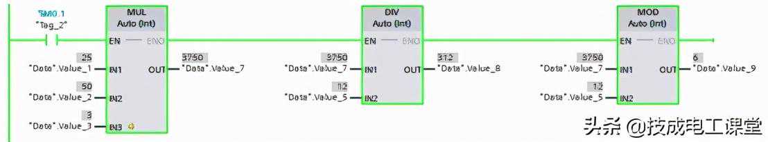 乘法指令MUL和加法指令是一样的,可以增加输入IN的管脚,实现多个数据相乘的运算(IN1×IN2×IN3×……×INn=OUT)。除法指令DIV使用整数的数据类型进行除法运算IN1÷IN2=OUT,注意OUT存储的是商的结果,余数是不存储的。