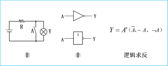逻辑非就更为直接了,简单来说就是取反。我们直接以下图的电路图为例,依然是以A表示开关的状态,1表示闭合,0表示断开;Y表示灯的状态,1表示灯亮,0表示灯灭;在这个电路中,开关一旦闭合,电灯就被短路而熄灭,也就是说,当A=1时Y=0,A=0时Y=1。这种因果关系就是逻辑非,也称逻辑求反。