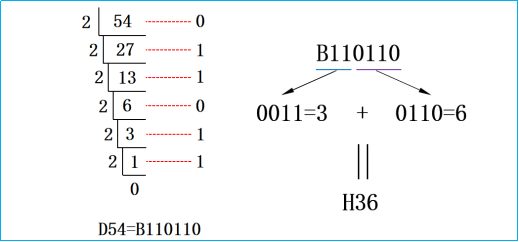 有点难度的是把十进制数转换为其他进制,李老师在课程中就讲得比较详细,例如在下图中,把十进制数54转换为二进制数,如下图,分别除以2,从下到上取余数,得出相对应的二进制数B110110。当然,如果想把十进制转换为八进制,那就除以八,依次类推。