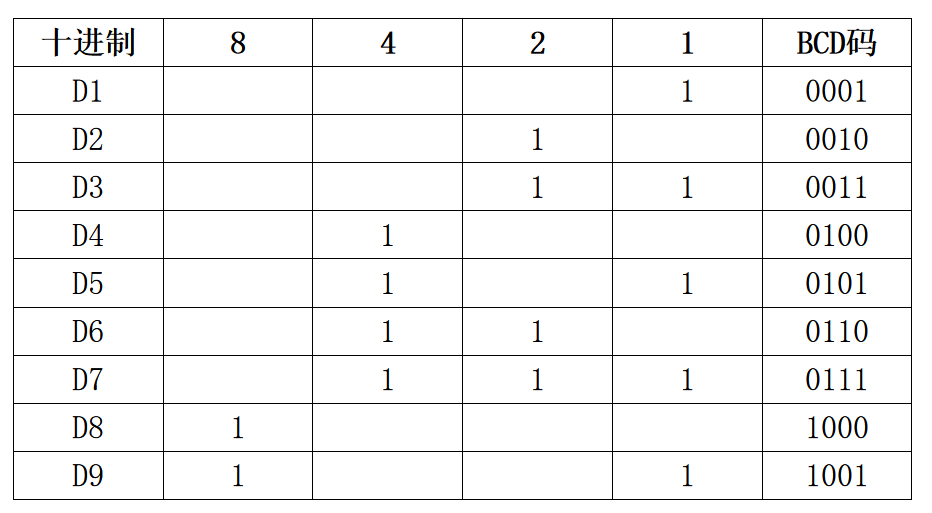 那么,怎么快速地确定各个十进制数的对应BCD码是什么呢?例如D7,我们这样做,上图所示,7用8、4、2、1中的哪几个数可以相加得到,显然是4+2+1=7,对应BCD码就是后三个数要为1,即D7=0111BCD。