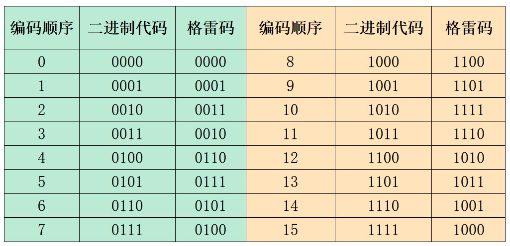 格雷码又称循环码,在格雷码中,每一位的状态都按一定的顺序循环。如下图所示,在格雷码中,从右到左,如果从0000开始,最右边一位的状态是按0110顺序循环变化,右边第二位按00111100顺序循环变化……依此类推,每左移一位,循环变化的0和1的数目就增加一倍。格雷码最大的优点就是,相邻两个代码之间只有一位发生变化,例如编号12的格雷码与编号11、13格雷码对应位,只有一个变化。