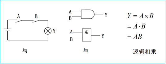 若以A、B表示开关的状态,1表示闭合,0表示断开;Y表示灯的状态,1表示灯亮,0表示灯灭;显然只有A、B同为1时,Y才为1。