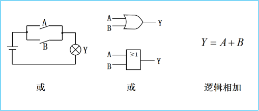 再如下图的电路中,同样是以A、B表示开关的状态,1表示闭合,0表示断开;Y表示灯的状态,1表示灯亮,0表示灯灭;显然,只要有一个开关闭合,灯就可以亮,只有两个开关同时断开时,灯才会灭,这种因果关系就称为逻辑或。