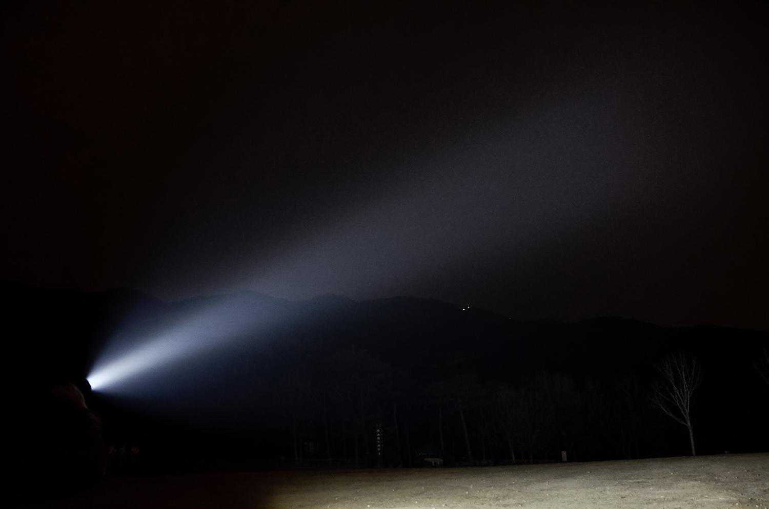 光电配合到位,在开阔的户外场地,就能看见明亮清晰的光柱效果,10000lm的最高光通量、中心聚光效果强,主光柱开射角度大约为5°左右,泛光角度大约在80°,也是远泛兼顾的效果。