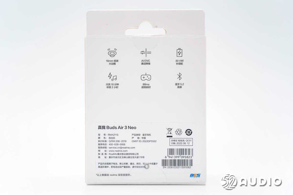 包装盒背面有产品的详细功能特点:10mm低音大动圈、AIENC通话降噪、30小时长续航、快速充电、88ms超低延时和蓝牙5.2连接;下方贴有产品的出厂标签,型号:RMA2113,颜色:流光白,制造商:Realme重庆移动通讯有限公司,产地:中国。