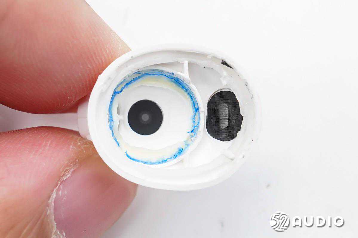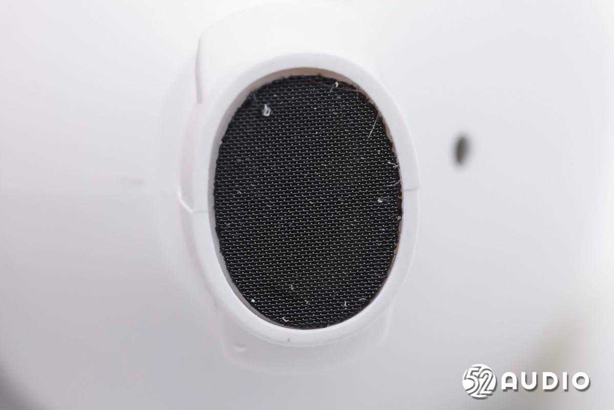 耳机内侧的泄压孔特写,内部防尘网防护。