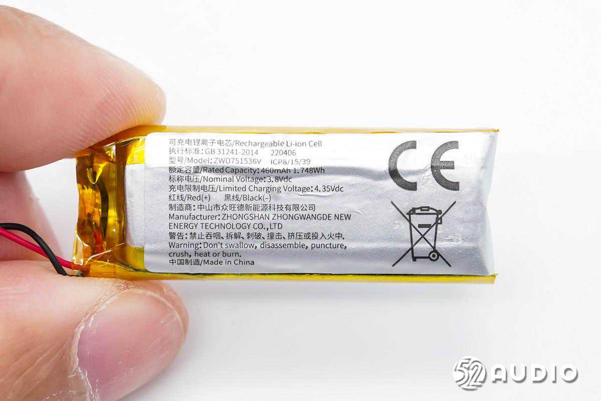 充电盒内置可充电锂离子电芯型号:ZWD751536V,额定容量:460mAh/1.748Wh,标称电压:3.8V,充电限制电压:4.35V,制造商:中山市众旺德新能源科技有限公司,中国制造。