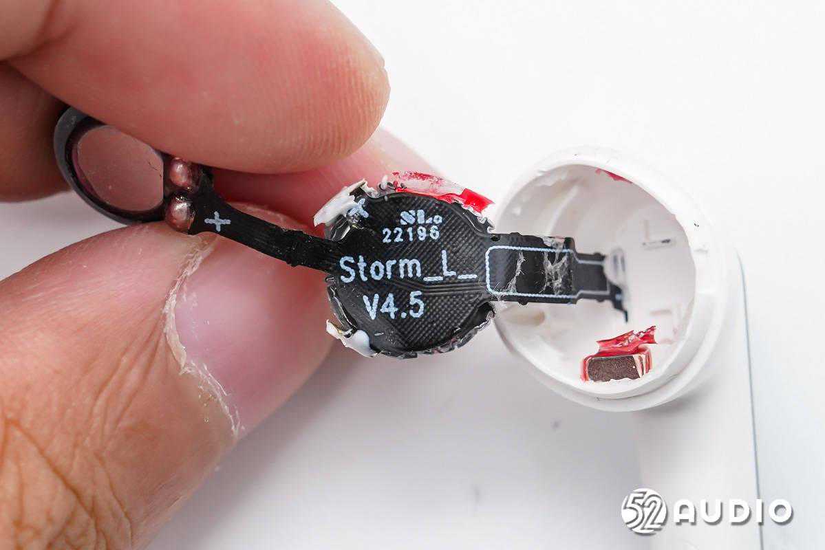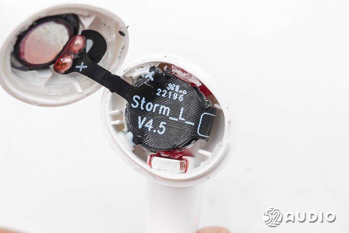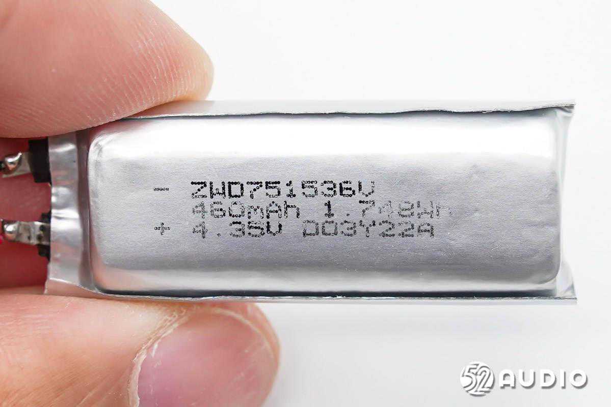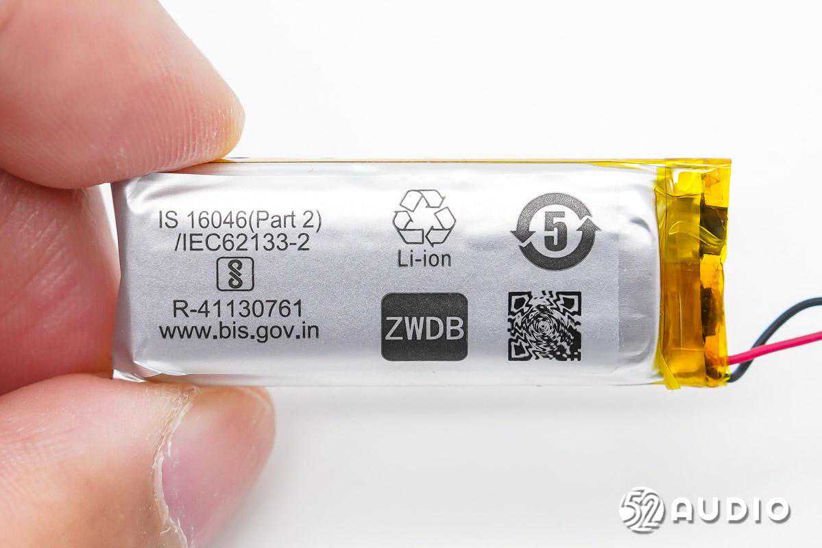 耳机内部采用了软包扣式电池,丝印有二维码,用于产品追溯。