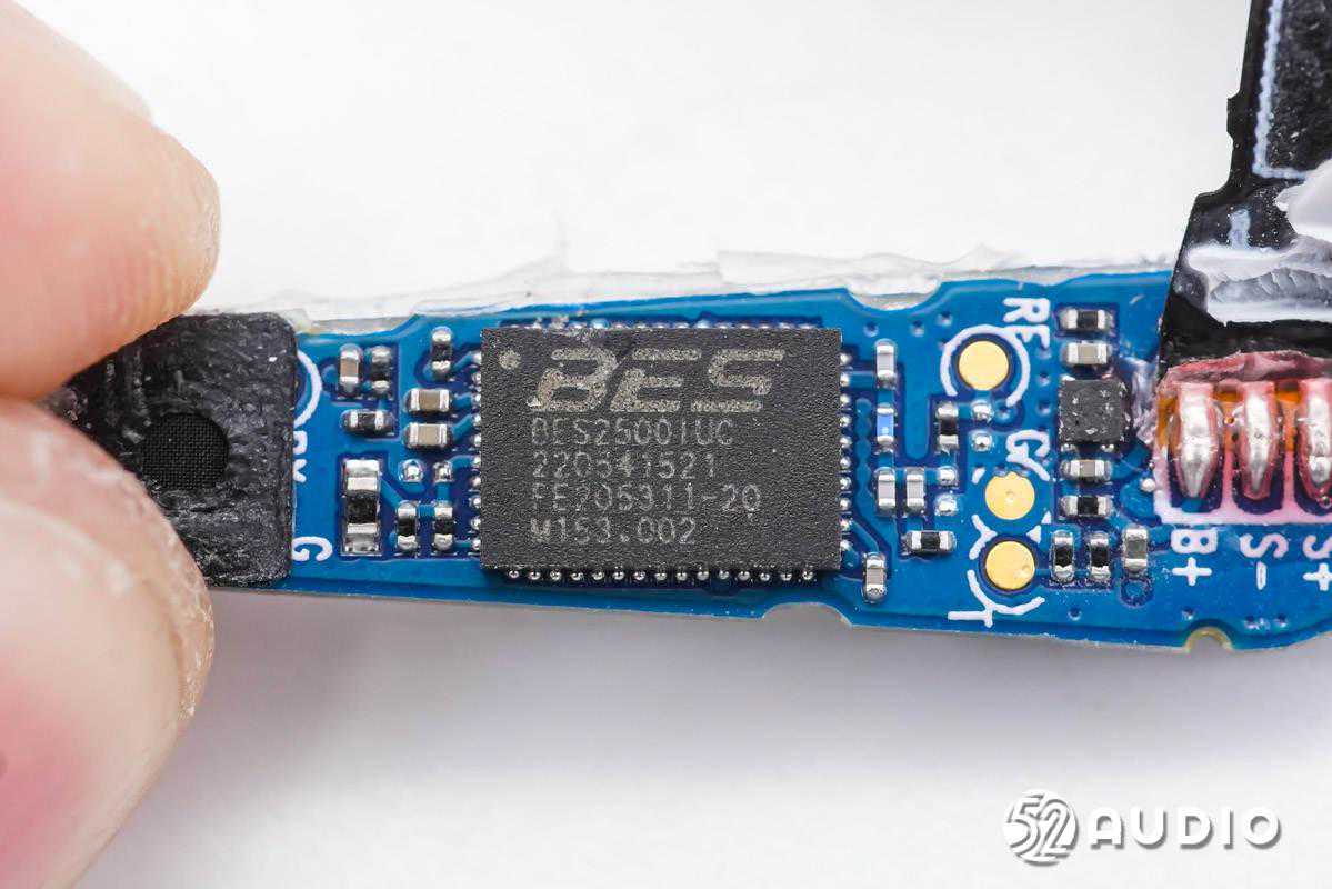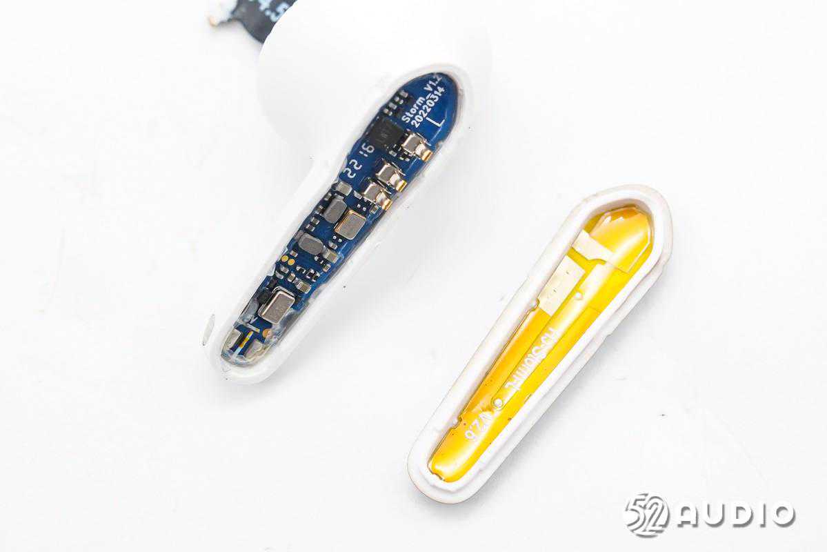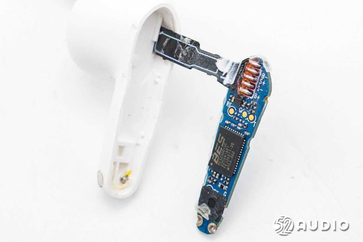 耳机内部,耳机头内采用10mm动圈单元,0.148Wh软包扣式电池,串联在同一条排线上再连接到耳机柄内主板。主板上搭载了恒玄BES2500系列蓝牙音频SoC,支持蓝牙5.2,为高性价比方案;创芯微CM1126B-GAC带船运模式二合一单节电池保护IC,实现对电池的过充电、过放电、过电流等保护;以及单颗MEMS麦克风,用于语音通话拾音。