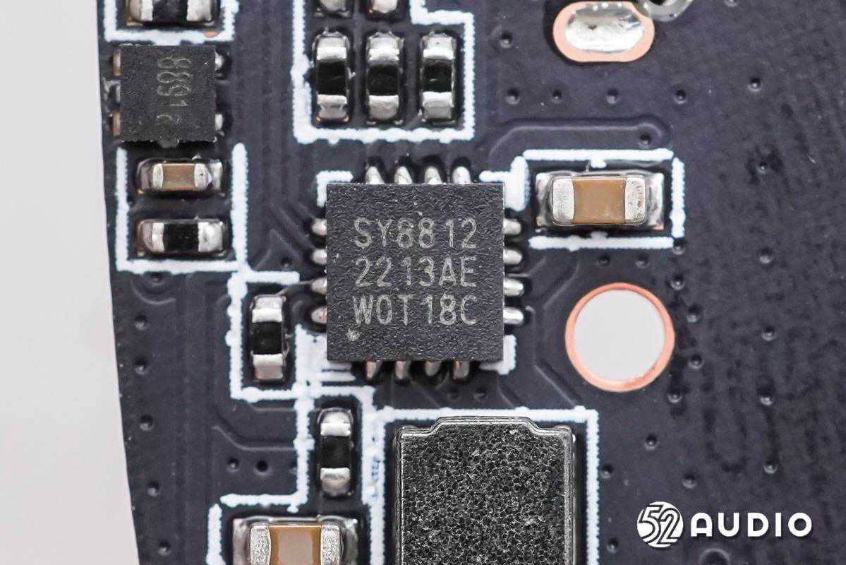 内部电路方面,充电盒采用了精睿兴业Type-C接口输入电源,内置众旺德460mAh电池,采用创芯微CM1127-CBS一体化锂电保护IC;思远SY8812充电盒SoC负责电池的充放电管理,充电电流外部可以调节,支持独立的负载存在检测和负载插入检测,同时支持输出电流检测,还集成NTC保护功能;晟矽微MC35P7050单片机,用于整机控制。