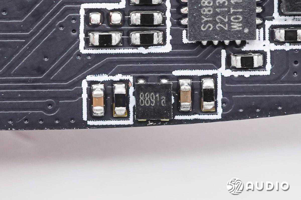 丝印8891a的霍尔元件,用于感知充电盒开启/关闭时的磁场变化,进而通知充电盒MCU和耳机与已连接设备配对或断开连接。