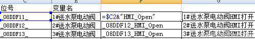 首先要规划变量,我们习惯性的做法是设备尾号加后缀的方式,这样做的好处是在做程序可以通过前缀替换来提高编程的效率,如我的系统中有100个电机,首先我会在程序中建立一个电机的控制块,然后建立控制电机需要的变量:如果电机的位号是M1001-M1100,这时候我们可以借助excel表格进行编辑,首先确定位号对应电机的名称,如下图所示