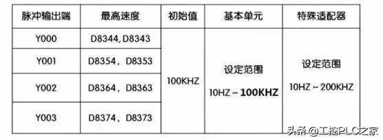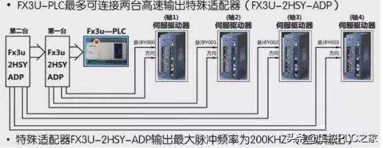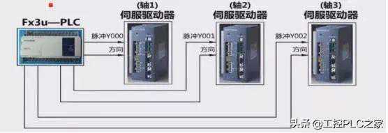 通过一个FX3U的CPU就可以带三个轴的伺服驱动器。PLC的脉冲输出端是固定的,Y0、Y1、Y2。具体是否具备脉冲输出可看模块的手册。其余的Y可以作为方向的输出端。输出的最大脉冲频率为100KHz。