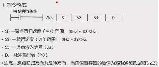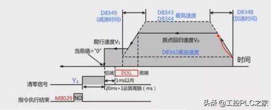 首先以S1的速度快速运动,当到近点S3后切换到爬行速度S2,D为输出。只能在原点的正方向才能使用原点回归指令,在反向是不能使用ZRN指令的。