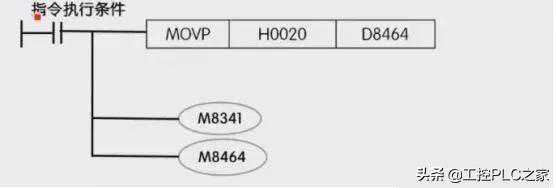 上图中当执行条件满足,将M8341=1,M8464=1,将Y20送到D8464.