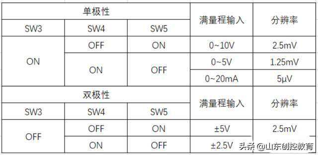 模拟量输入模块支持电压信号和电流信号输入,对于两种信号的选择由DIP开关设置,量程的选择也由DIP开关来完成,模拟量输入模块EM231的8路输入的组态开关表如图2所示。