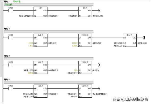 -20~110℃被温度变送器转换成4~20mA电流信号,4~20mA信号经量程为0~20mA的模拟量输入通道转化成0~32000的数字量。即数字量6400~32000对应温度-20~110℃。所以程序如下: