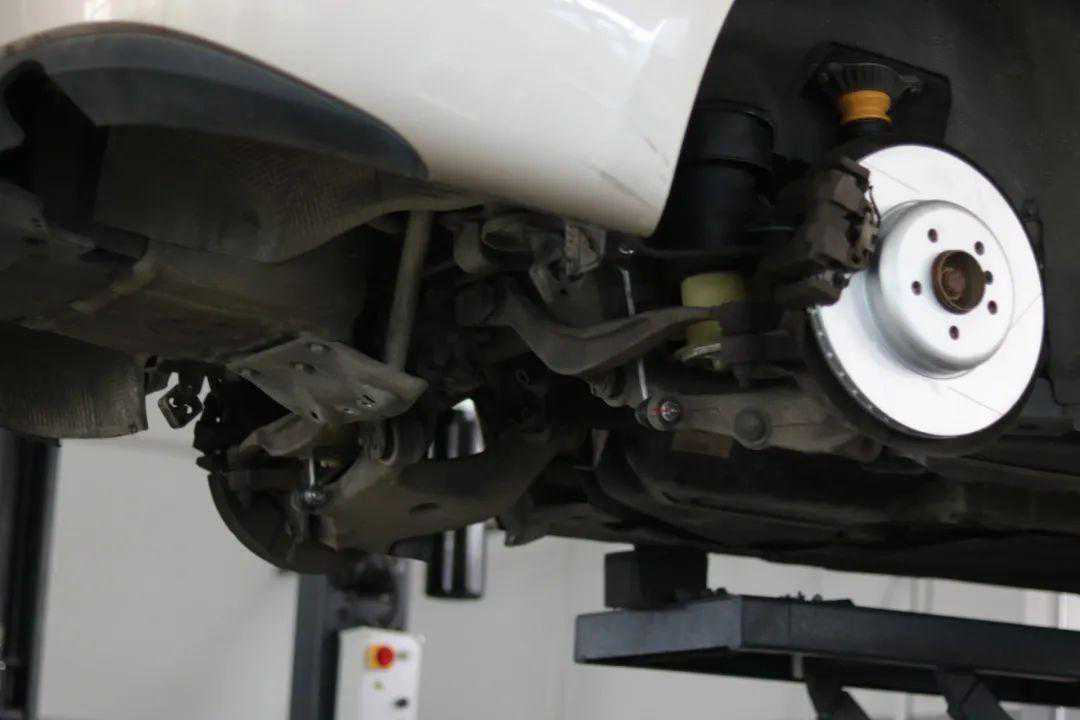 先分解前悬挂系统,避震、羊角、拉杆、摆臂、刹车都拆除了。