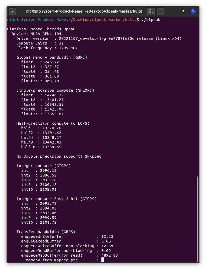 除了上面两款测试外,Windows平台就没有太多跑分软件了。所以我们转战Linux平台,在Ubuntu下看看还能不能测出一些数据。我们试试看使用clpeak,测试它的显存带宽以及单精度浮点(FP32)性能。最终测出来的数据如下:显存带宽最大为365Gbps、单精度浮点最大为13.9TFLOPS。