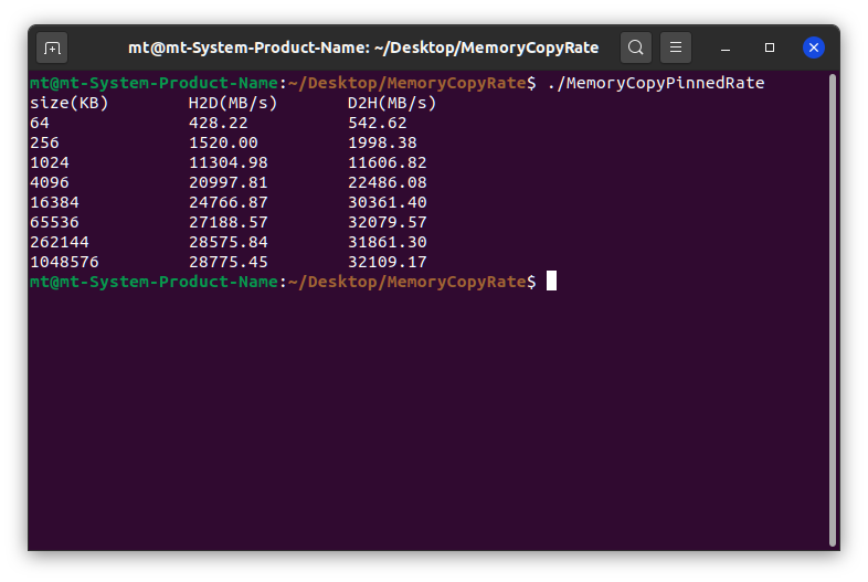 前面我们有提到,MTTS80是首款支持的国产显卡,因此我们也测试了一下它的PCIe带宽,我们在Ubuntu下使用OCLBandwidthTest进行接口上下行测试,实测上传最大带宽为28G/s,下载最大带宽为32G/s,这个速度是目前大部分主流显卡的一倍。可以说MTTS80是一张“战未来”的显卡了。