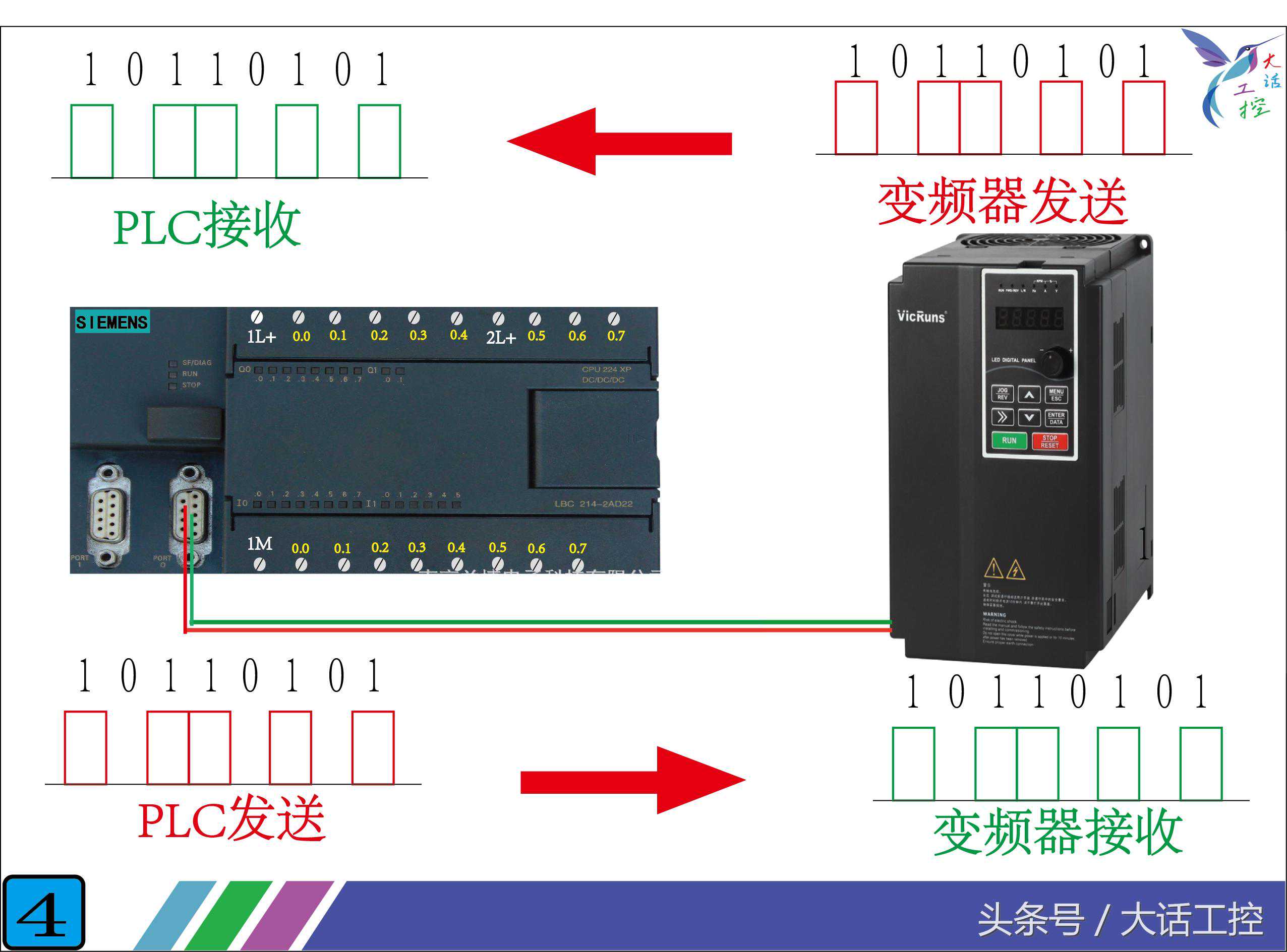 图4,就是PLC和变频器的1对1的通信示意图,PLC通过通信端口把输出电压变化8次,就能输出8个0或1,分别是10110101。因为变频器的通信端口和PLC的通信端口是连接在一起的,所以当PLC的通信端口电压变化时,变频器的通信端口就能检测到电压的变化。它就能知道PLC给它发送的是0还是1,这样PLC让电压变化8次以后,变频器就能收到和PLC发生的一样的10110101这一组数据。