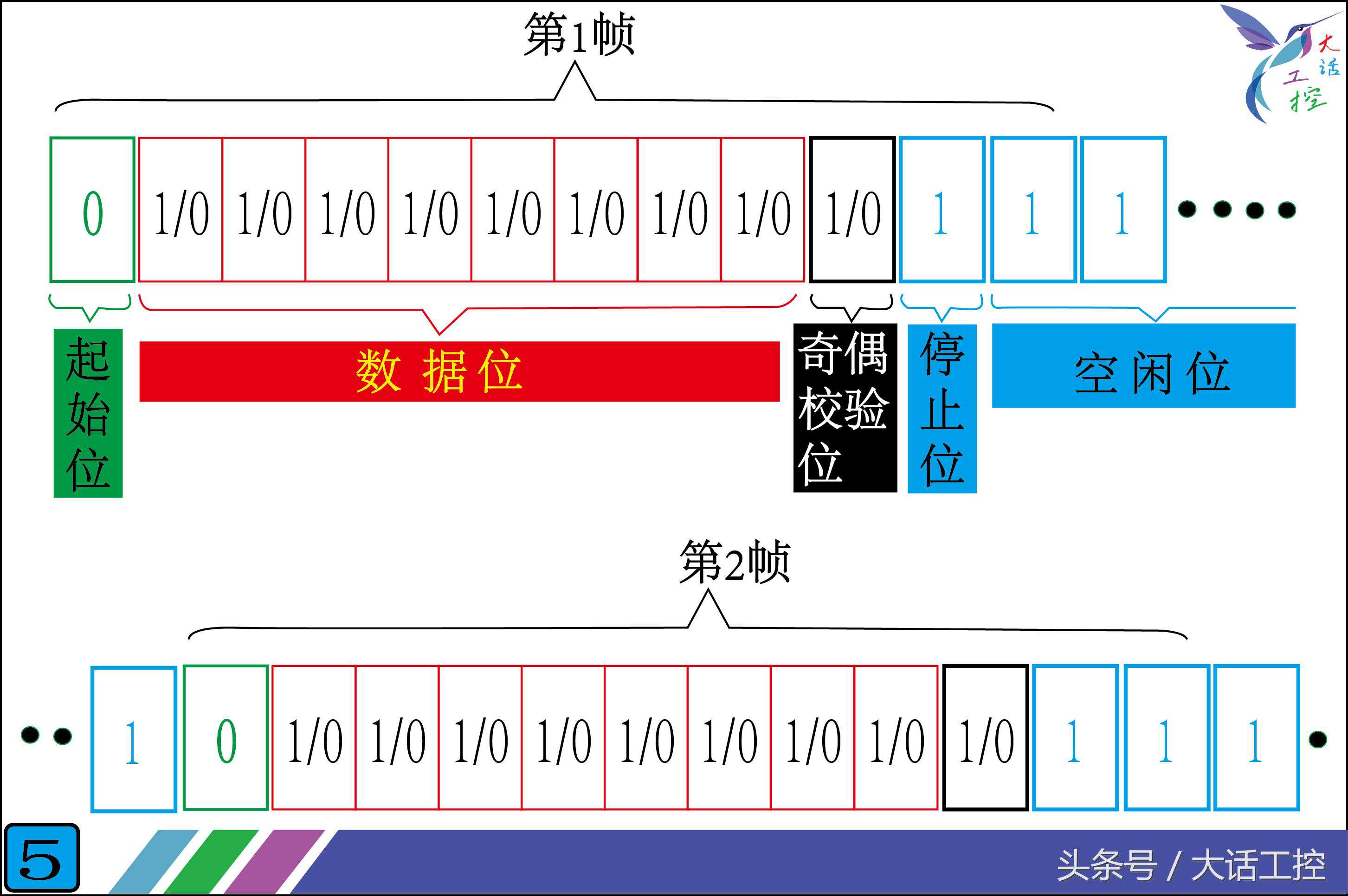 图5,是数据通信的格式,这是外国人在发明通讯时就规定好的,我们必须按这个格式发送数据。这个格式就是“帧”,我们进行通信时最少要发送一个“帧”。不能发送半“帧”,那样通信就会失败。