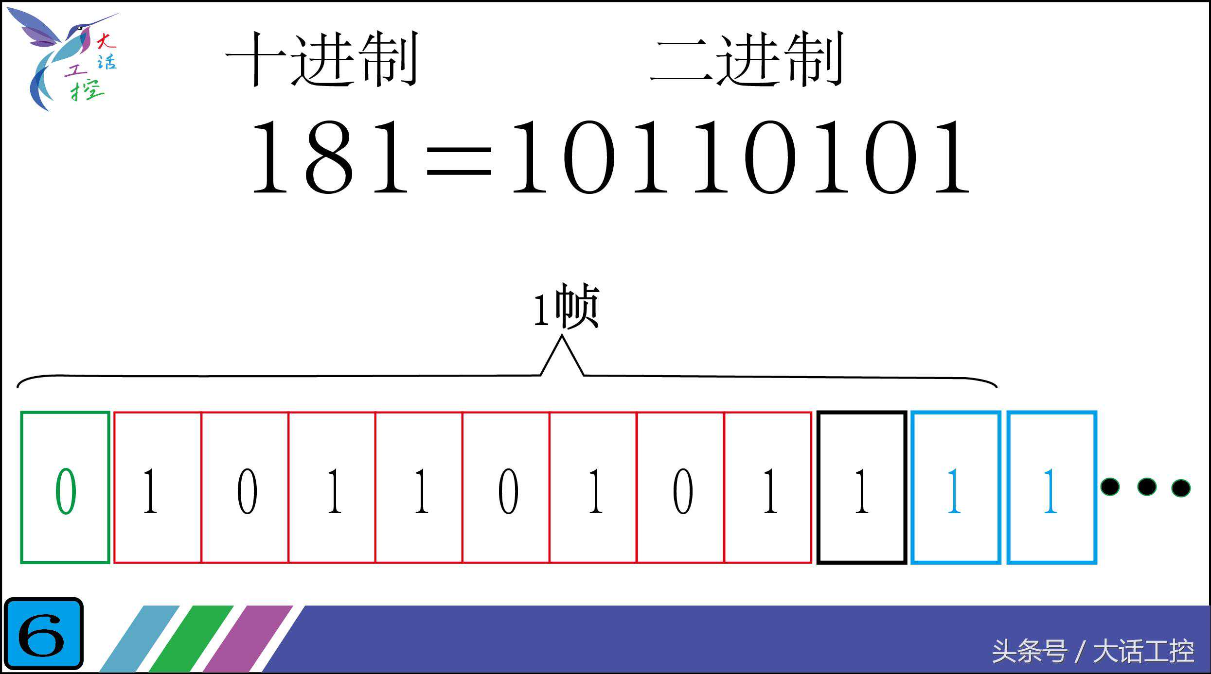 图6,是一个例子,它演示的是PLC把十进制的181这个数传送给另一个设备。我们知道十进制的181转换成二进制就是10110101(怎么转换看我以前的讲解,这里不再重复),然后通过一个帧把它发送出去。这个例子如果你能看明白,说明这一节的内容你已经掌握了。