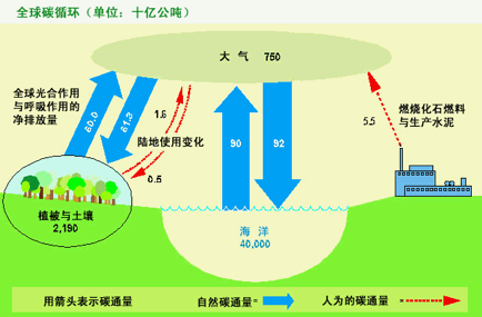 植物的初级生产力就是指固碳的能力。绿色植物通过光合作用将空气中的CO2转化为葡萄糖,进一步转化成为植物体的碳化合物。化合物经过食物链的传递,进入动物体内。植物和动物进行呼吸作用把体内的一部分碳以CO2形式释放回大气,另一部分则构成生物的机体或在机体内贮存。动、植物死后,微生物将尸体分解将碳排入大气。大气中的CO2这样循环一次约需20年。