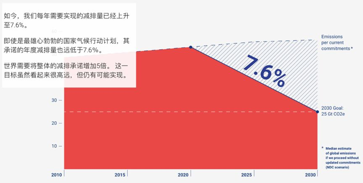 然而理想总是很丰满,现实总是很骨感。如果想要达到《协定》中的目标,现在我们的年度碳减排量要达到7.6%,已是世界减排承诺总量的5倍。