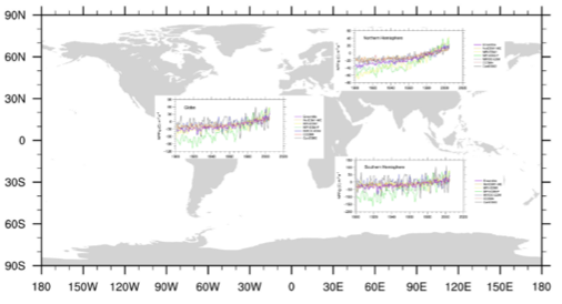 近百年来全球NPP(左中),北半球NPP(右上),南半球NPP(右下)变化趋势