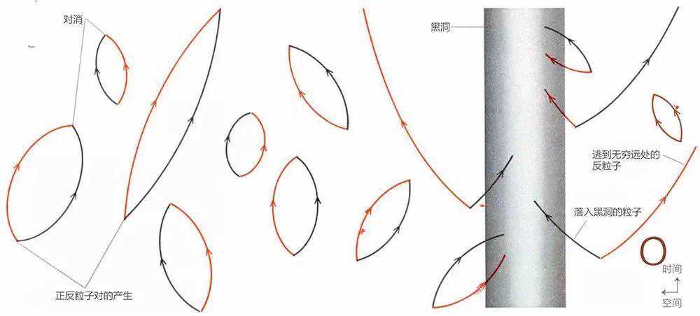▲霍金辐射指出如果真空中的虚粒子对出现在黑洞的事件视界附近,且其中一个意外进入事件视界,那个粒子就被黑洞吸入,而另外一个无法湮灭,从而被发射出去,同时带走黑洞一部分能量。