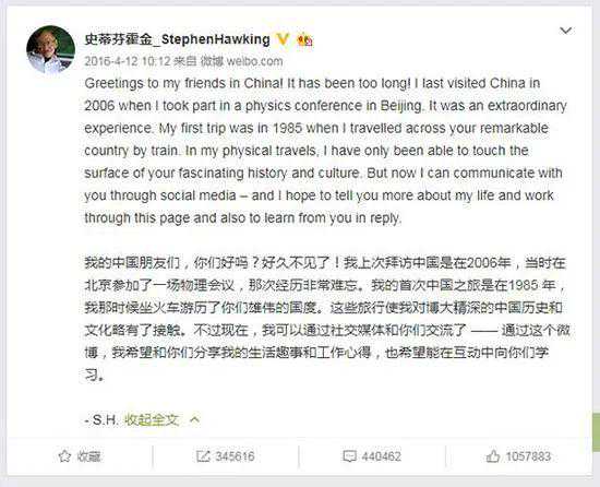 ▲霍金在2016年开通微博并发出第一条微博问好,2天吸粉300万,网友表示这哪是科学家,这是一代网红!