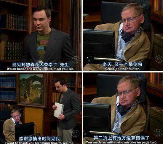 围绕着几个科学技术宅展开故事的热门美剧《生活大爆炸》经常会cue到各种科学家们,霍金也不例外。他曾以客座教授的名义到谢尔顿所在的大学授课,指出了谢尔顿研究中的错误。看着倒地的谢尔顿,霍金淡定吐槽:“又一个晕倒粉”,成为了剧中的经典片段之一。