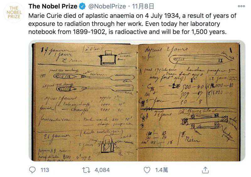 ▲居里夫人记录实验的笔记本一直保存至今,诺贝尔基金会称上面的辐射仍未消退,预计千年不散。