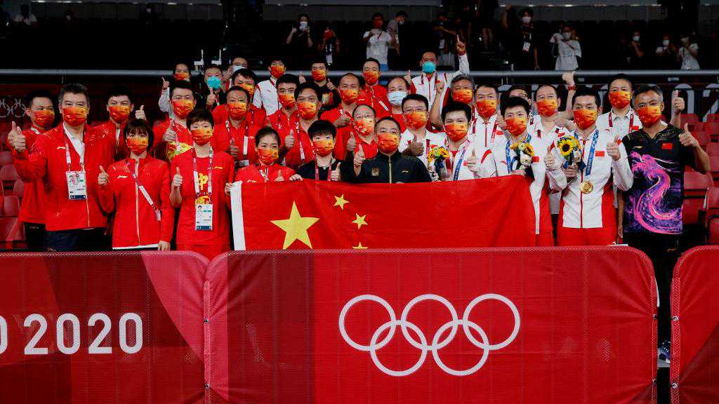 Chineseplayersandstaffposeforagroupphotographwiththenationalflagafterthemedalceremonyofthemen'steameventattheTokyo2020OlympicGamesattheTokyoMetropolitanGymnasium,Tokyo,Japan,August6,2021.[Photo/GettyImages]