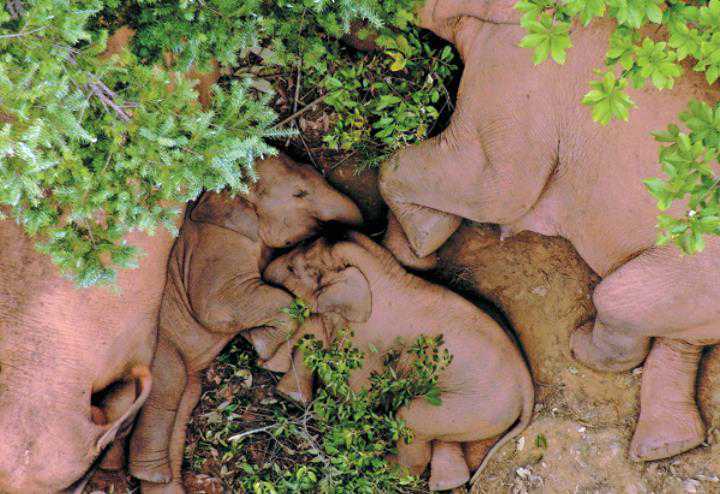 TheroamingelephantsrestinEshancounty,Yunnan.[PhotoprovidedtoChinaDaily]