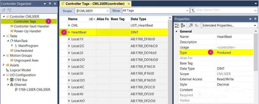 2.由于这两款控制器,都属于ABLOGIX5000系列,那么,它们之间实现通信交换数据非常方便,本文使用的方法是生产/消费者标签,1769-L30ER作为生产者,1756-L72作为消费者,在1769-L30ER项目中,控制器名称为CML30ER,在控制器标签域中配置生产型标签HeartBeat,数据类型DINT,标签类型Produced,详见下图.
